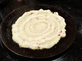 Heat the frying pan on the stove on medium heat. Using a red onion, spread little bit of oil onto the frying pan/tawa and make the surface uniform and smooth before pouring the batter. When its sizzling hot, reduce the flame and pour one round of batter into the center and slowly extend it and make a big round like below.  Apply oil along the sides of the Adai and in the middle. Fry the Adai on medium heat on both sides.