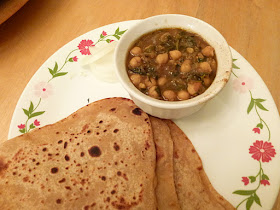 Chole, a famous Punjabi food is one of our family favorites too.. As I have abundant home grown methi leaves ( fenugreek leaves ), I opted to make "Methi Chole" side dish for my chappathis. This time, I was keen in making the dish in a traditional punjabi way. On a snowy winter day, a plate of hot chappathis/rotis with a side of hot spicy chole definitely adds joy to the day. This time, I referred to my small recipe slip which i have been preserving since years given by my Delhi neighbour. In those days, my punjabi friend used to feed us with so many specialities. Chole was one of them in her list. Thanks to her tips and recipe, I am blogging this Protein Packed Methi Chole with you all...