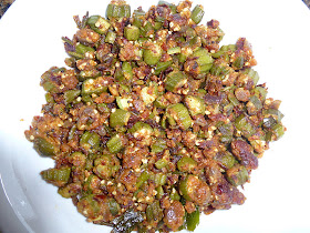 - Fry the okra mix on a low flame till they get fried uniformly with all the spices coated. Stir the fry in the middle so that they get fried uniformly. No need to add any besan ( Bengal Gram Flour ) to make it crispier. The taste of the fry is definitely unique with the mix of red chilli powder and groundnut powder..