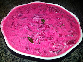 Beetroot, a deep red rooted vegetable can be eaten either in cooked form or raw, shredded in salads. This mild sweetish vegetable is an excellent source of antioxidants and nutrients. Juice of this vegetable helps in lowering the blood pressure and its useful for preventing cardiovascular problems. Beetroot curry is the most common version made out of this vegetable. My mom used to make "Beetroot Morkootu" at home during my childhood. The gravy is made out of fresh coconut, green chillies, ginger, thick fresh yogurt and cumin seeds. Mild sweeter beetroots in the spicy, yogurt gravy is really delicious as it has varieties of taste inside.