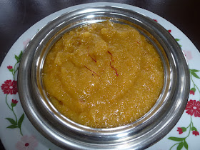I used a fresh Mango for making this yummy kesari. Peel the skin and take out all the mango flesh. Follow the same method of preparing regular kesari and add the mango flesh when rava starts cooking. For good flavour and colour, I added few strands of Saffron to this Kesari. Did not add food colour to this version. All other ingredients and method of preparation remains the same as normal kesari.